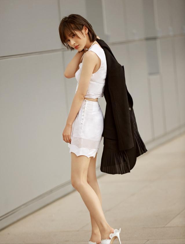 想要显高的身材比例,你在单品的选款上尽量选择高腰的裙装和裤装,成套的更好,不仅营造了竖向的线条,而且提高了腰线的高度。像王子文这身,白色的高腰上衣,配半裙及同色的高跟凉鞋,气质十足。