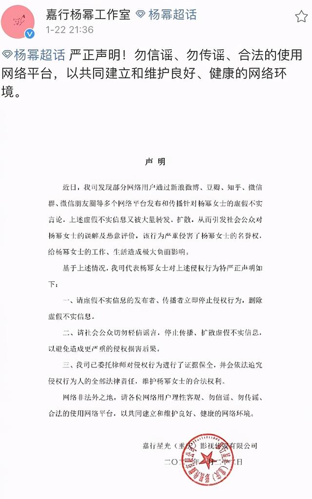 对此杨幂工作室在1月22日晚9点36分发布声明回应此事:
