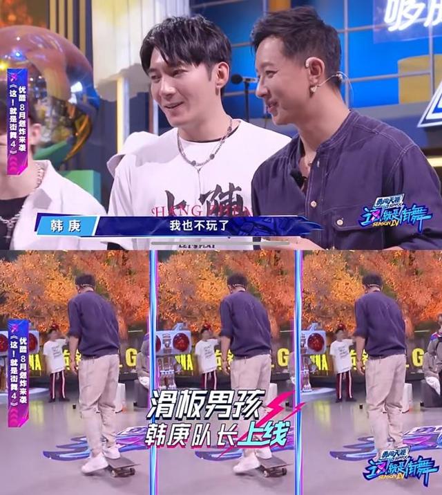 另一边的韩庚队长,看着热闹的录制场地,笑意盈盈的眼里透露着一丝欣慰,目光追随着舞者脚下的滑板,顿时又闪出了一股子跃跃欲试的光芒,嘴上说着“我也不玩这个”,jio却已经踏上了板子。