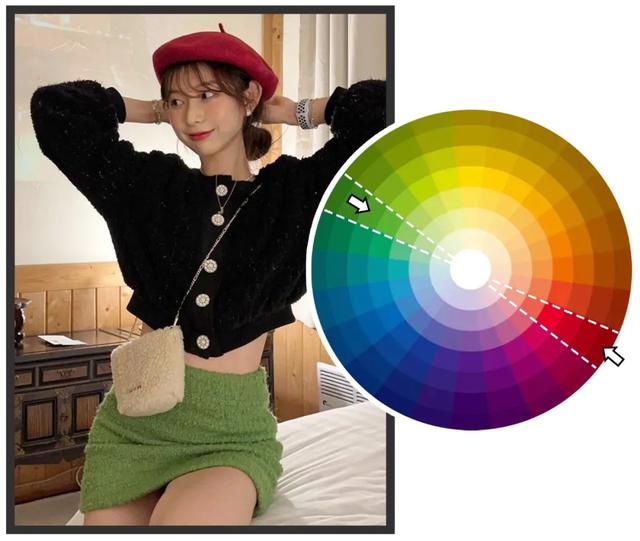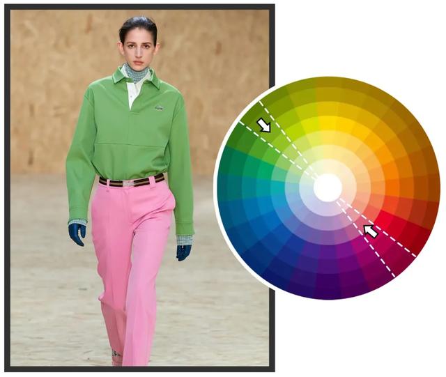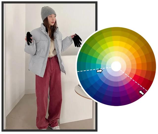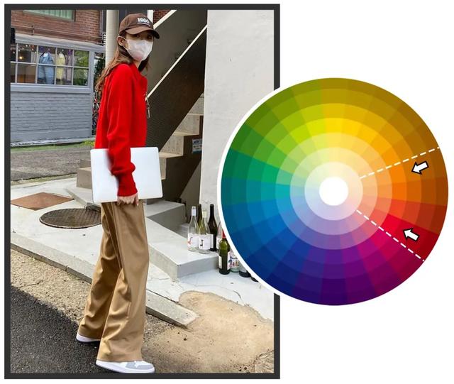 撞色的颜色越多越容易显凌乱,如果能保证穿搭中的对比色、互补色只有一组,整体穿搭还是可以很和谐的。