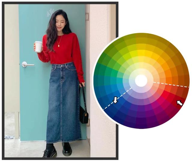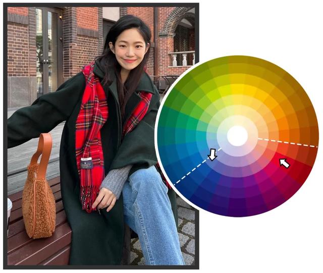 对比色搭配:红色和蓝色是对比色,把两个颜色用在面积相对较小的围巾和牛仔裤上,给整体搭配带来活力感的同时又不会显得突兀。