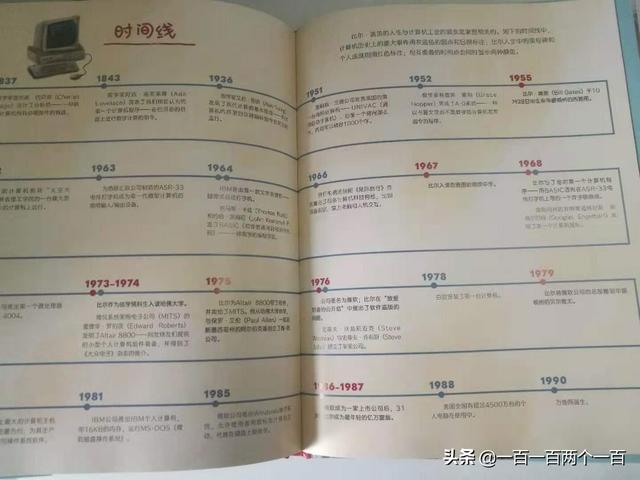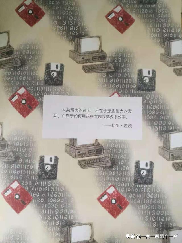 绘本的最后有一个时间线,起始于1837年数学家查尔斯·巴贝奇设计了一种具有现代计算机所有必需部件的分析机,终止于2017年比尔盖茨和妻子创建的基金会捐出了455亿美元资金应对饥饿、疾病和贫穷。