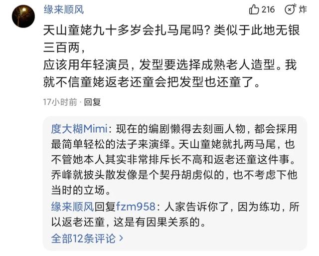 舒畅版的天山童姥,两个马尾辫的造型曾被不少网友吐槽。因为天山童姥虽然长得年轻,但实际上已经是个八九十岁老人了,没必要因为外表年轻,硬要用两个马尾辫来凹造型,显年纪小。好在舒畅演技到位,除了造型没什么可吐槽的地方。