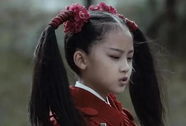 剧中的“天山童姥”一出现,就是一身红衣造型。上扬的眉毛,加上凌厉的眼神,这个年仅9岁的小女孩,颇有天山童姥的气势。