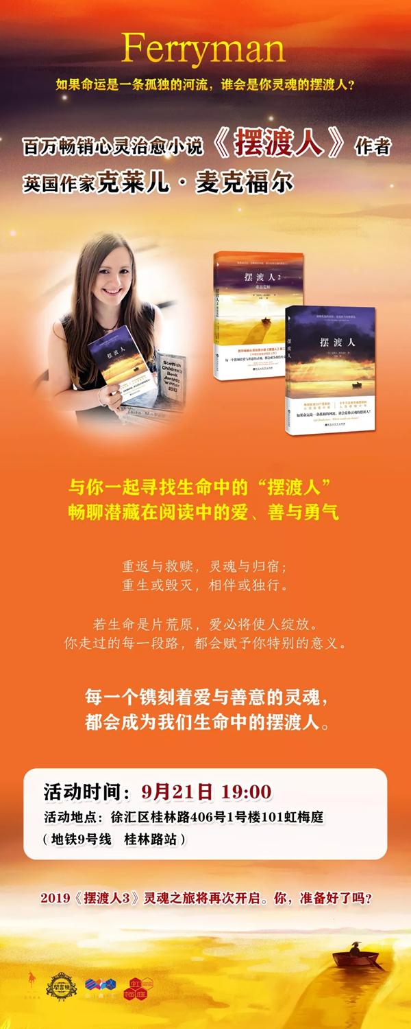 克莱儿·麦克福尔《摆渡人》是英国作家克莱儿·麦克福尔创作的小说,作者从少年人的角度洞悉人性的温情,通过男女主人公的所见所感,道出所有人对亲情、友情和爱情终极幸福的向往。在2018年的9月下旬,克莱儿要踏上摆渡自己的旅程,来到她灵魂的归处“中国”,与我们一起寻找生命中的“摆渡人”,畅聊潜藏在阅读中的爱、善与勇气,开启2019年《摆渡人3》的灵魂之旅。9月21日晚,让我们和克莱儿一起,做生命中长河中的灵魂“摆渡人”。
