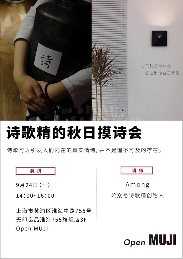 Among长相神似机器猫的女孩阿蒙,自2013年起每天读诗一首,并写成读诗笔记分享在网络上,引来了众多同好关注。从线上到线下,她也在不断探索者诗歌与日常生活结合的种种可能。阿蒙认为诗歌可以引发人们内在的真实情绪,可以打开人们的真心,并不是遥不可及的存在。此次与Open MUJI一拍即合,阿蒙将带大家进行一场轻松有趣,又充满互动的诗歌摸诗活动,一起过一个特别的中秋节吧!