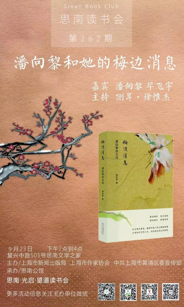 潘向黎、毕飞宇、徐惟杰潘向黎写小说,写散文,谈茶,读古诗词。她的散文,就像她在说话,率性透明,披肝沥胆;她的小说,悠远轻渺的意境背后有一个明亮豁达,又柔软又英气,充满现代性的自我。潘向黎作品中深邃而迷人的古典气息与她自幼沉浸于古诗词的艺术氛围中密切相关。而她对古诗词的解读,不是“我注六经”的做学问,而是“六经注我”的性情解读和自由阐发,《梅边消息:潘向黎读古诗》就是潘向黎这种风格的最新力作。9月23日下午,潘向黎携新书《梅边消息:潘向黎读古诗》,与小说家毕飞宇、SMG主播徐惟杰作客思南读书会262期,与读者分享古诗词之美。