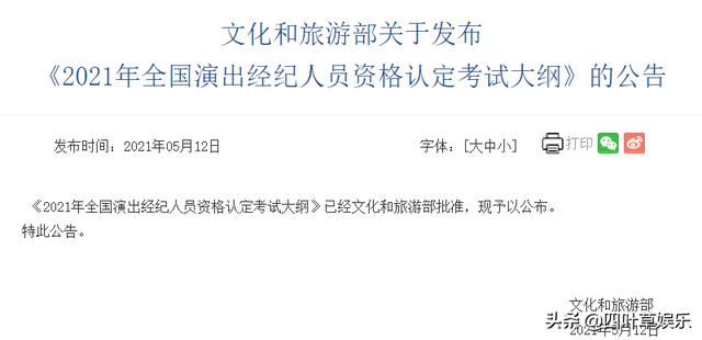 早在今年五月份的时候,文化和旅游部就发布了一则公告,那就是《2021全国演出经纪人员资格认定考试大纲》的发布。那么这份公告背后的寓意是什么呢?那就是官方要加强对经纪人员的管理,不让不学无术之辈当经纪人,教坏艺人了。
