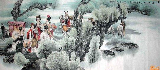 三月三日阳春时节天气清新,长安曲江河畔聚集好多美人。