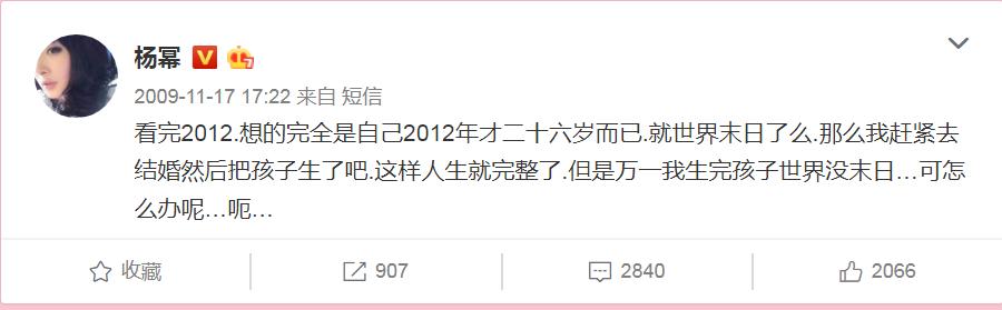 她也说过如果2012真的是世界末日,那她想赶紧结婚生小孩。由此后来她和刘恺威在一起并且14年就生下小糯米确实是她的选择。