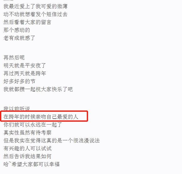 会坦言自己不太开心所以失踪让所有人担心了,也会把她的那份少女心公之于众。“在跨年的时候亲吻自己爱的人,你们就可以永远在一起人”