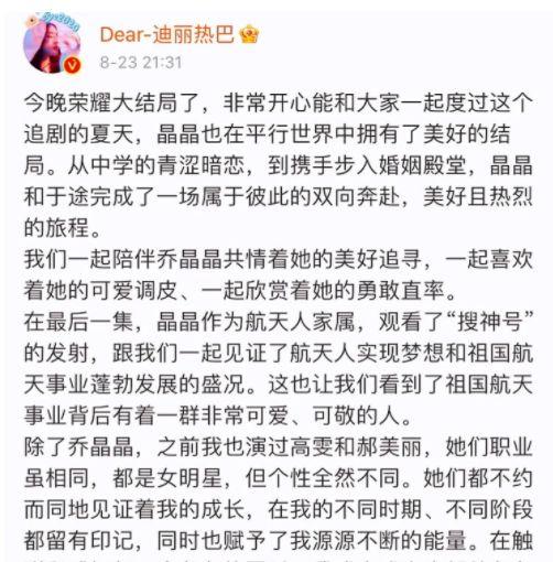 由杨洋和迪丽热巴主演的电视剧《你是我的荣耀》终于在8月23日晚迎来了正式的大结局,随后,两位主演也分别在微博发出了告别的微博。