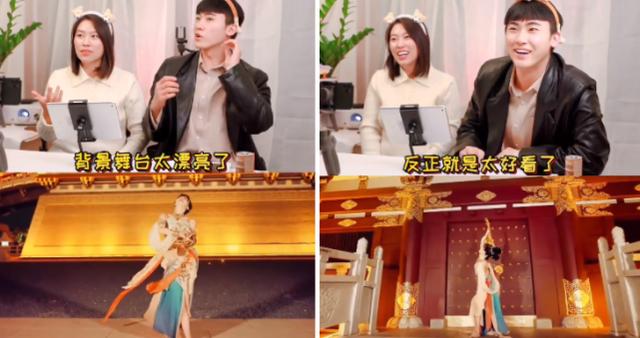 两人观看紫颜舞蹈时,还在研究背景舞台是不是中国的古典建筑,又讨论起她手中拿的是不是琵琶,总之就是太好看了,看来这波文化输出是稳了。