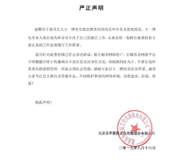 近日,有网友爆料称艺人王一博与一名富家千金正在恋爱,引起网友热议。今日(8月16日)上午,王一博所属公司乐华娱乐针对此事发声明辟谣,称相关传闻均为无中生有及恶意捏造,王一博现在尚为单身,且专注于自己的演艺工作。