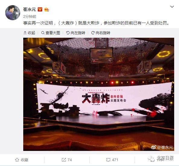 紧接着,崔永元发微博称:“事实再一次证明,就是大欺诈,参加欺诈的目前已有一人受到处罚。”