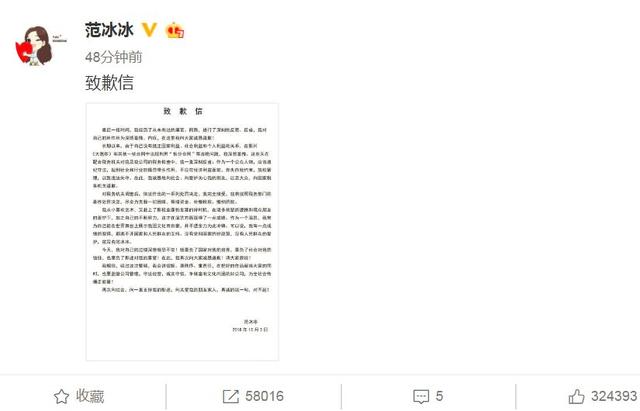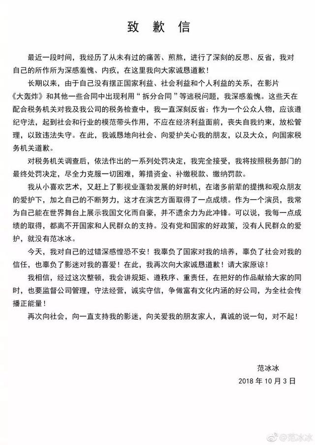 10月3日中午,范冰冰就逃税事件发布道歉信:对税务机关调查后依法作出的一系列处罚决定,完全接受。将按照税务部门的最终处罚决定,筹措资金、补缴税款、缴纳罚款。