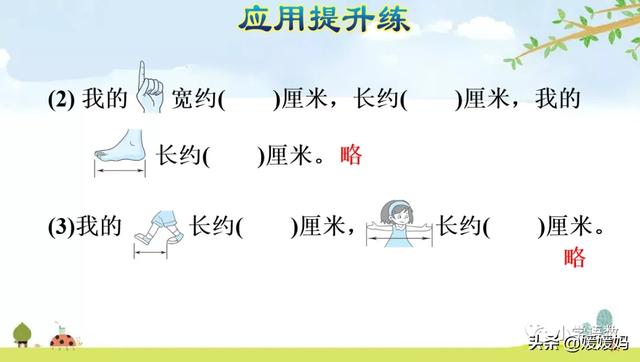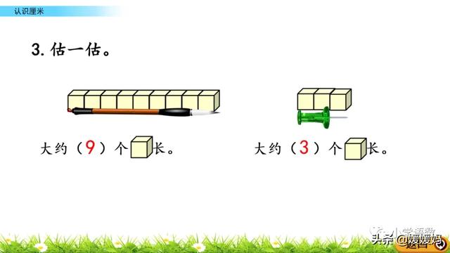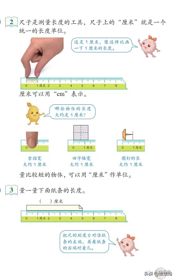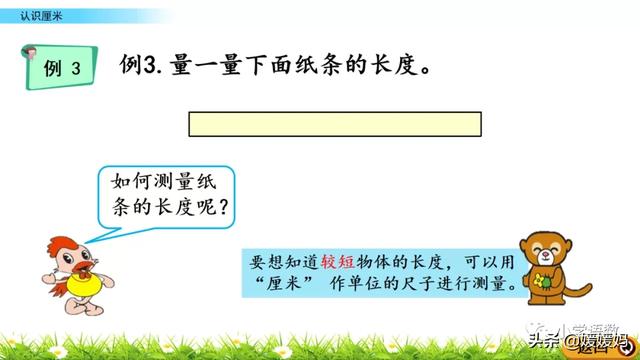 2.测量较短的物体,可以用“厘米”作单位,厘米可以用“cm”表示。