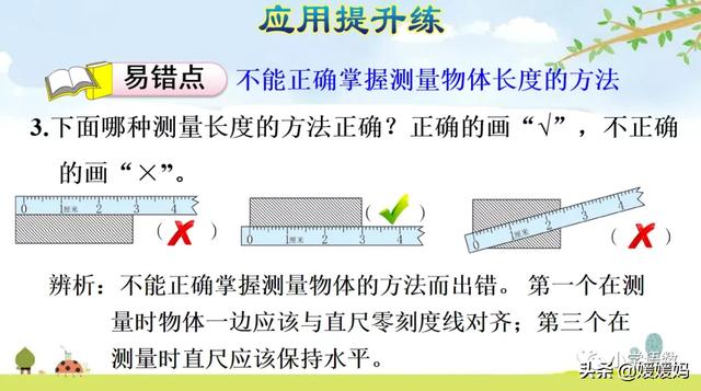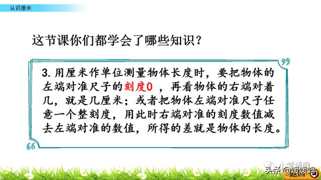 3.在用尺子测量物体的长度时,要注意把尺子的0 刻度对准物体的左端,物体的右端对着几就是几厘米。