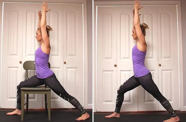 - 双手向上举过头顶,呼气,屈右膝向下,初学者可以将右大腿靠近椅子,进阶练习者可以尽量沉髋向下