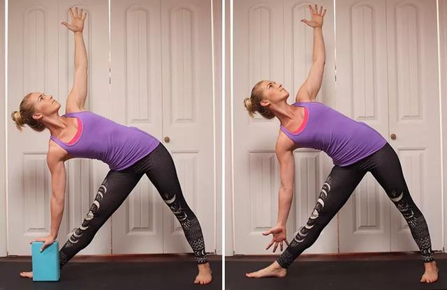 - 右膝盖与脚尖同向,吸气延展脊柱,呼气,躯干向右侧弯,初学者将右手放在瑜伽砖上,进阶练习者可以将手抓住脚踝