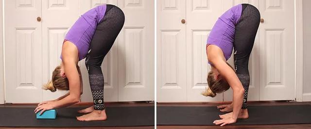 - 前屈向下,腹部靠近大腿,低头,双手放在垫面上,进阶练习者可以双脚并拢