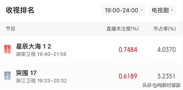 收视排名上,《星辰大海》压了《突围》0.13个点,排名第一,市占率更是以4.037%远远超前。
