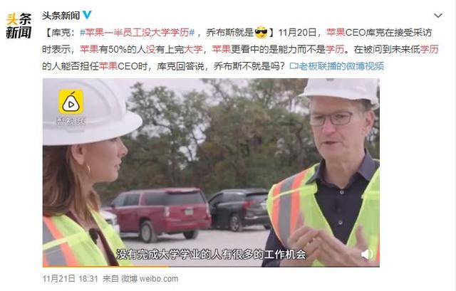 昨日,苹果公司CEO在接受记者采访时表示:“苹果有50%的人是没有完成大学的人,没有大学学历依然会有很多工作机会,因为能力会更加重要一点。”