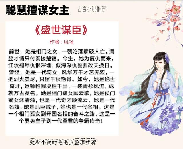 小短评: 女主从相门孤女到侯门嫡女,再到一国女相。 男主从纨绔皇子到一国之君,然后一统天下。 一条相门孤女到开国名相的奋斗之路, 一段弱势皇子到一代圣君的争霸传奇! 男主负责貌美如花,女主负责赚钱养家,男主负责武力值,女主负责脑力值,权谋基本不是男主干的~主线就是很俗套的女主复仇,男主一统江山,男主真的是很任性~一句话解释有本事,你来打我呀