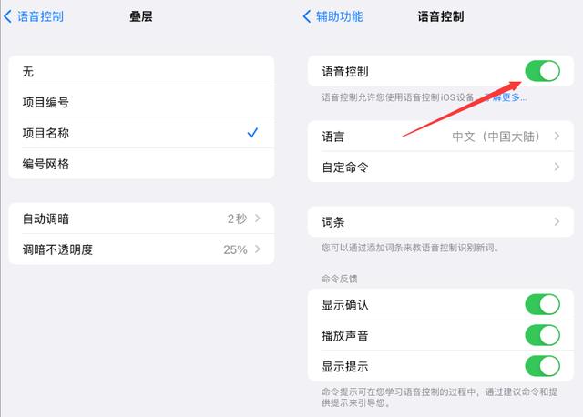 打开设置-辅助功能-语音控制-叠层-看看你要设置编号还是项目名称,这里意思是手机显示内容,