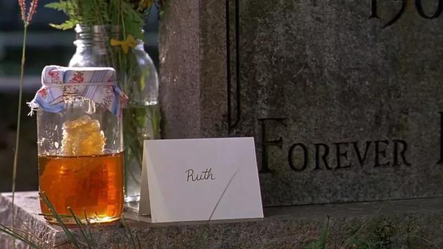 结尾处,艾芙琳陪着妮妮老人来到墓地,发现在露丝的墓前有一瓶新采的蜂蜜和一张明信片。