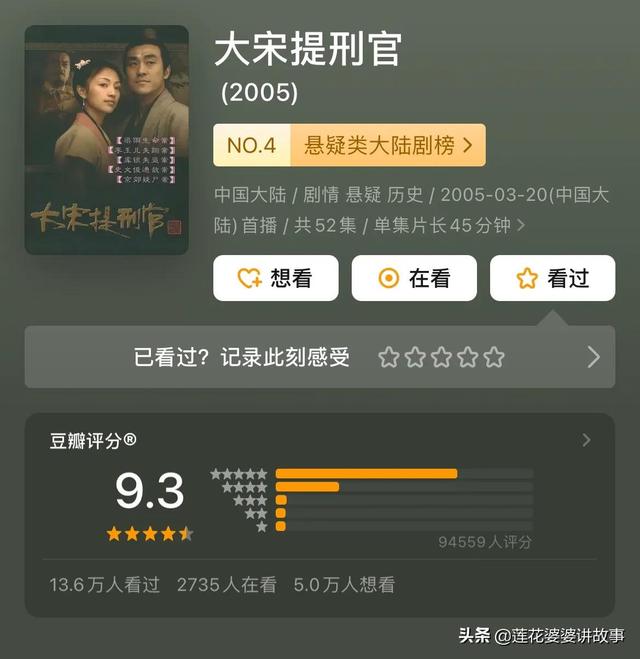 这部剧当年收视率超过新闻联播。就这么火,但是毕竟多年前的电视剧了,年轻的朋友还是有没看过的。这部剧有不少说不通的地方,比如剧中的好多官职不对,从未谋面的两人,能从人来人往的大街上一眼认出对方来,剧中叫曹墨的人二十多岁,他的老母亲已经守寡了三十多年?小桃红唱的昆曲是明朝才有的,可是电视剧才宋朝啊!不止这些,这样得瑕疵在剧中有很多处。假如忽略这些的话剧情还是很精彩的,推荐观看。