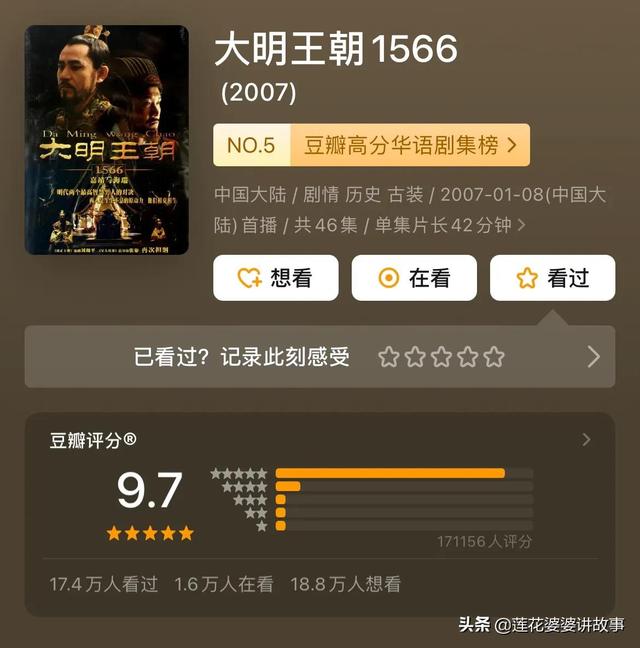 这部历史正剧评分非常牛B,历史正剧剧本很难,什么剧情你得有依据,不像穿越剧,架空剧等随便写,想怎么写就怎么写。但是历史正剧没有一个好剧本,播出时会有成千上万人跳出来指责你改编历史。这个剧的编剧刘和平。你可能不知道刘和平是哪位,简单介绍下《大明王朝1556》《李卫当官》《沧海百年》《北平无战事》《雍正王朝》国家一级编剧。加上一群老戏骨,精彩演绎《大明王朝1556》。