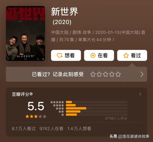 《新世界》豆瓣评分5.5我个人觉得有些偏低。剧中不足确实有,后半部分有点拖拉,但是也绝对不会只有5.5分,因为好多好多网友都在骂徐天的这也是没办法的事,徐天一个正面形象,但是角色但是非常不讨好。几乎一边倒的观众给一星。都带着徐天两个字。哎。剧是好剧,孙红雷和张鲁一真的演的很好。没看过这部去看的时候。就当徐天不存在好了,不然真怕演员尹昉看到这里心里不舒服。以下随便截图几张都是一星对徐天的评价。