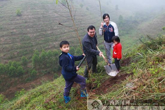 一家四口共植红豆林。广西新闻网记者 潘毅 摄