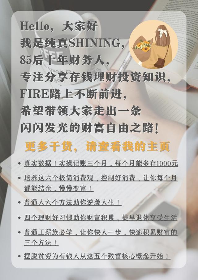 作者介绍:纯真SHINING,85后十年财务人,专注于分享存钱,理财投资知识,FIRE路上不断前进,希望带领大家走出一条闪闪发光的财富自由之路!