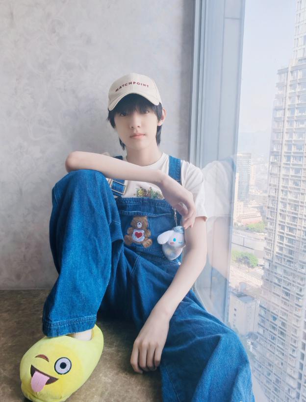 坐在飘窗台上的张泽禹面带微笑,白色T恤短袖,深蓝色的背带裤,戴着灰色的小发箍,修长白皙的双手,真的好好看。又将发箍更换成棒球帽,背带裤换成了小熊图案浅蓝色的,