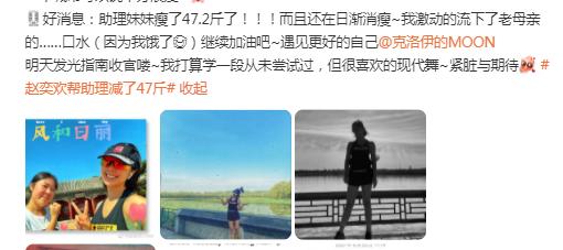 赵奕欢最近在社交平台分享和助理晨跑的照片,并配文“助理妹妹瘦了47.2斤了” 。