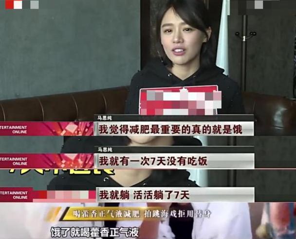 永远在减肥的马思纯也是个狠人,减肥方法是躺床上7天不吃不喝,饿了就喝藿香正气液,能活下来算她命大。