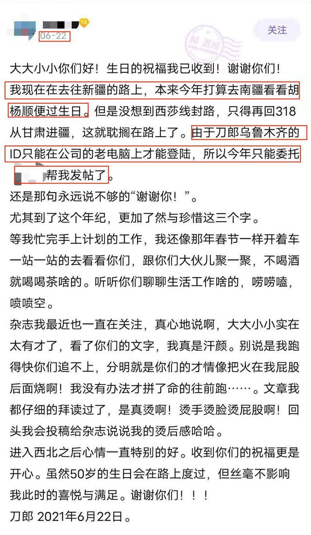 但是从刀郎给粉丝的信里可以看出来,他非常珍惜现在的生活,还去了南疆看胡杨、过生日,或许这才是他想要的生活吧!