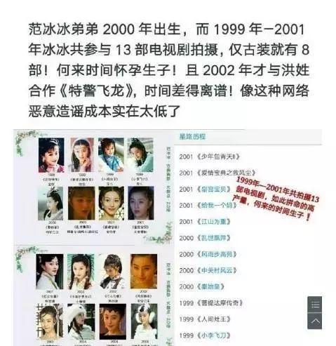 这么多年来,“范丞丞是范冰冰私生子”的传闻从来就没有断过!虽说网友们曾放出很多证据证明此为谣言,但是传言却是俞传俞烈!早在此传言刚刚传出的时候,就有网友晒出了范丞丞的出生那年,姐姐范冰冰的行程来力证!1999年到2001年期间,范冰冰先后拍摄了包括《小李飞刀》《少年包青天》等在内的13部电视剧!而且还不包括参加《快乐大本营》的综艺的活动!如此密集的行程工作,范冰冰根本不可能会有时间偷偷生子还不被人发现!更何况范冰冰跟洪姓打星相识更是在几年之后的事情!