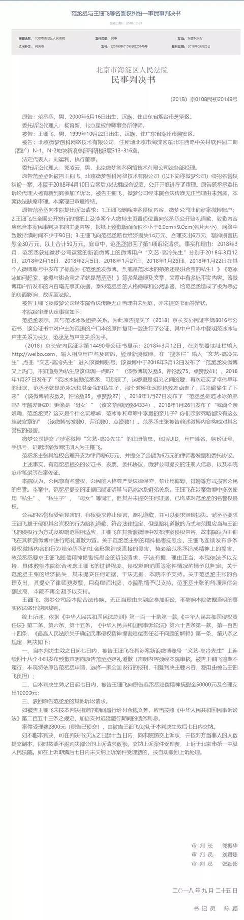 而就在2019新年的第一天,范丞丞又做了一件特别“刚”的事情!令网友大喊支持!原来,此前范丞丞首次对于网传自己是“范冰冰私生子”的传闻进行公开辟谣!并对散布谣言的用户进行了起诉!在法庭上范丞丞提供了户口本等证据力争自己与姐姐的关系!而在1月1日,范丞丞起诉王钿飞有关名誉权一案也终于有了结果:法院判定认为,范丞丞所提供的户口证明等证据,能充分证明两人的姐弟关系。因此判决被告方侵犯范丞丞名誉权,需要公开道歉并赔偿名誉损失!判决书判定被告方需在涉事微博账号上向范丞丞致歉,并持续48小时,或在面向全国发行的报刊上,公开道歉并赔偿六万元人民币!而被告人的年纪,是99年生人,仅比范丞丞大一岁!