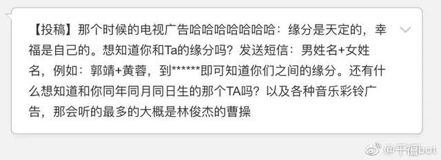 广告词可以背下来了“缘分是天定的,幸福是自己的,想知道你和Ta的缘分指数吗?发送短信:男姓名+女姓名,例如:郭靖+黄蓉,到××××即可知道你们之间的缘分指数”