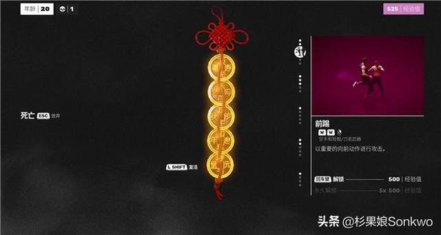 复活吊坠或许是《师父》最重要的组成部分之一,想必各位关注本作许久的玩家也已经有所耳闻。这个吊坠赋予了主角以年龄增长为代价换取复活机会的特殊能力,第一次倒下就老 1 岁,第二次倒下就老 2 岁,以此类推,直至年龄上限为止——这个时候,再倒下一次就是真的 Game Over 了。