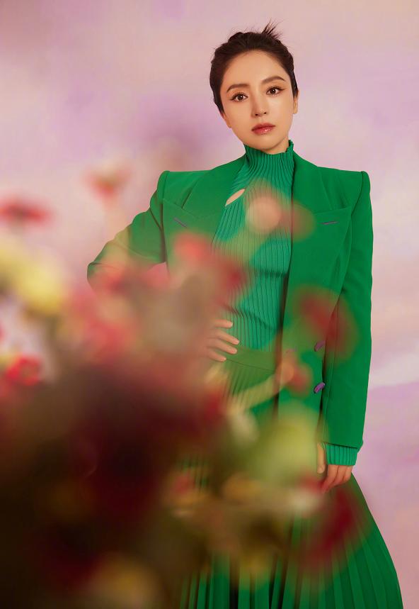 全绿色的搭配显现出的端庄、沉稳但是又很高级的着装效果,绿色显得富有