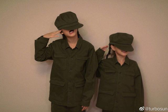 9月14日早,孙俪在个人社交媒体上晒出儿子等等和女儿小花的军装合照。