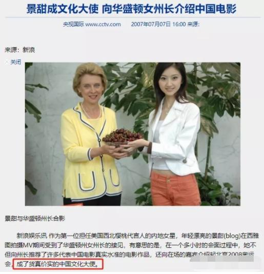 2007年,景甜,成为美国西北樱桃协会年度代言人,那个时候,她还不算一个正式艺人,