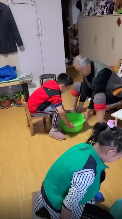 除了做一些日常的家务,刘和刚的两个孩子还会给爷爷奶奶洗脚。画面中两个小朋友各自端来一盆水放在老人家面前,样子很是认真,两位小朋友都十分孝顺懂事,看得出来作为父亲的刘和刚将孩子教育的非常好。