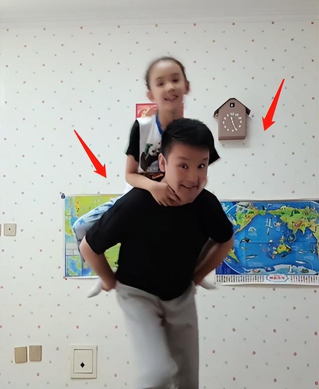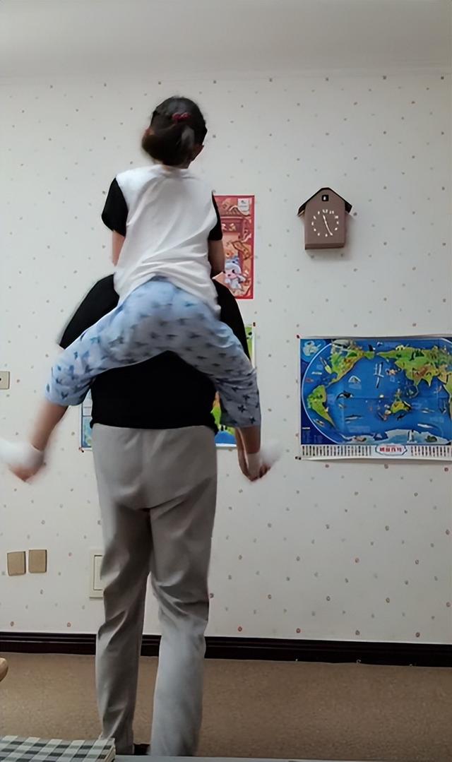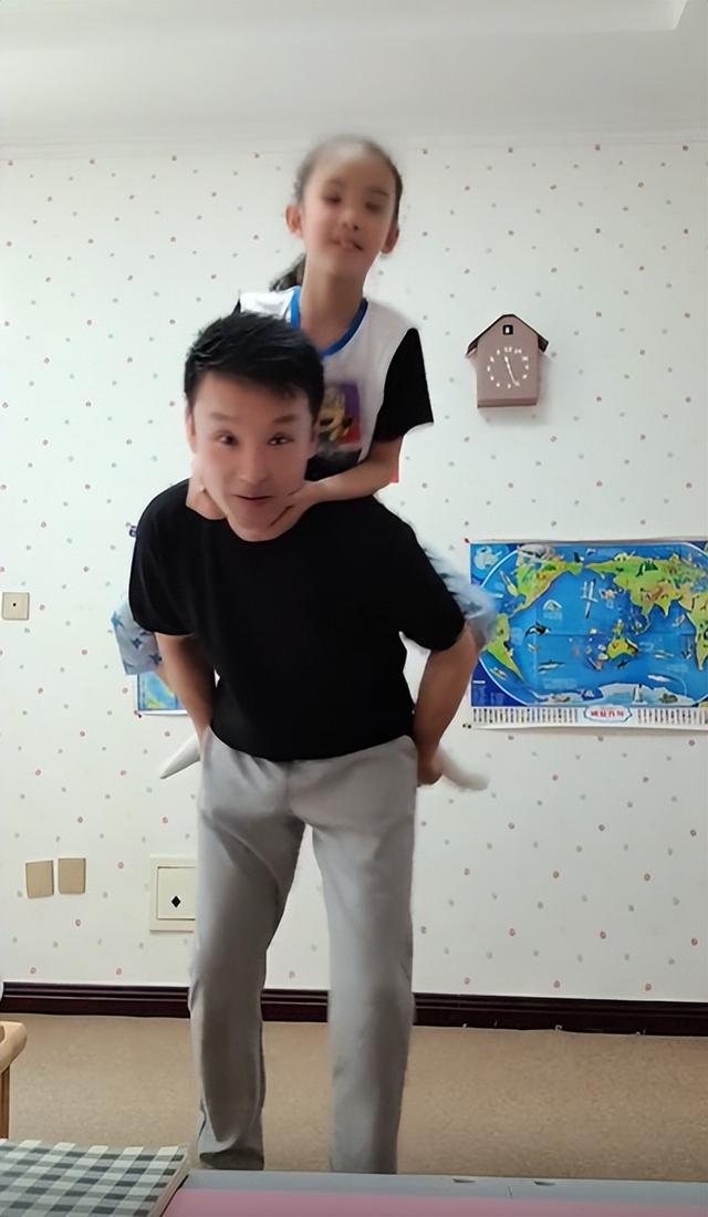 接着刘和刚转过身,他两只手抓着女儿的脚怕女儿掉下去,小朋友马尾辫晃来晃去,非常童趣可爱。刘和刚与女儿都穿着朴素低调,但却充满乐趣。