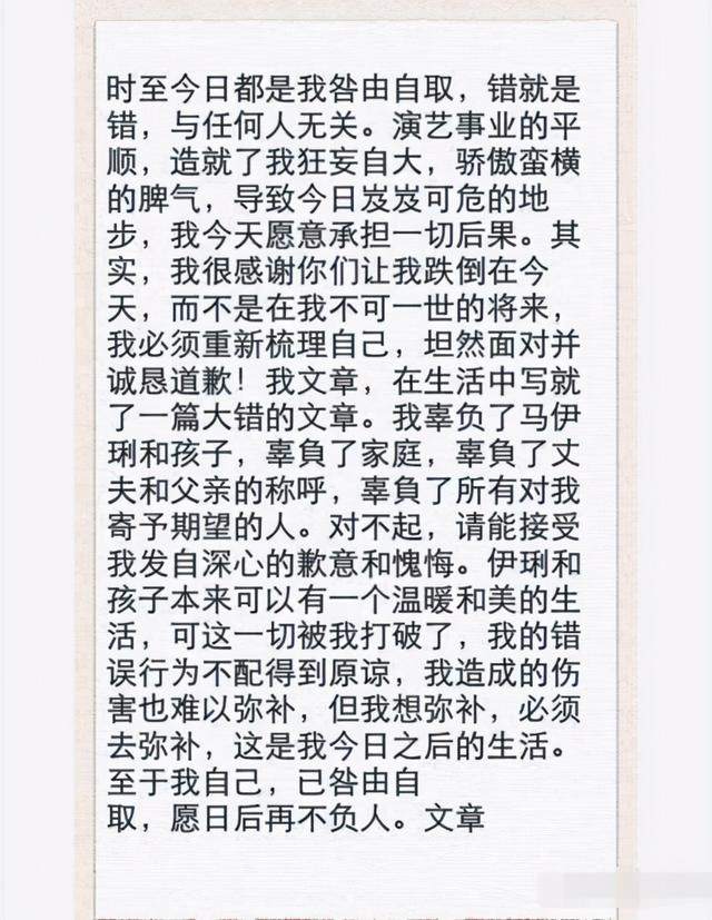 看事情败露,文章发了长文道歉,对自己的悔恨,对妻子马伊琍的道歉,对家庭的道歉。