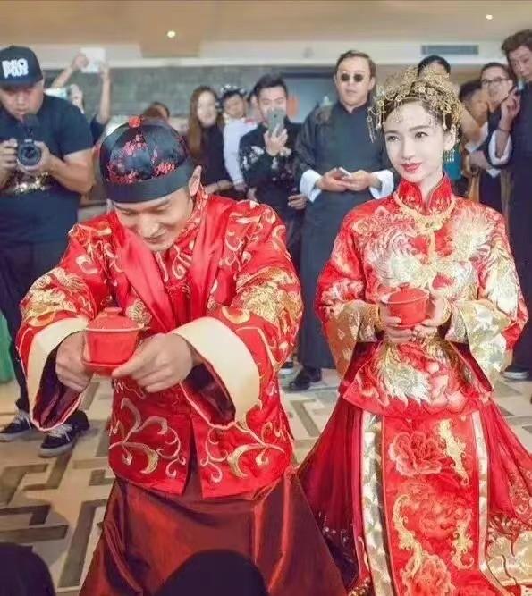 比如baby这身衣服就是中国红搭配金色,而当年刘诗诗在婚礼上身穿的风褂,就是偏粉色调的红搭配金线的刺绣。